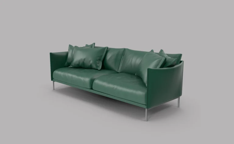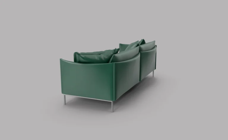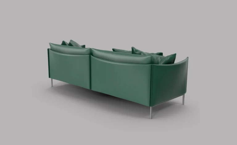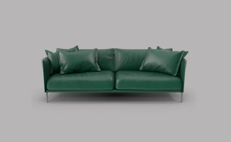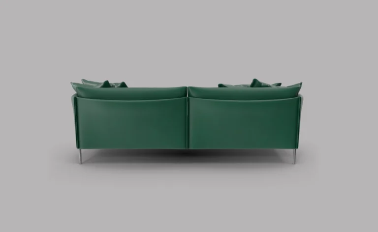 The Emerald Comfort sofa offers a striking deep green leather finish, plush cushions, and modern metal legs, making it a luxurious and stylish addition to any living room.